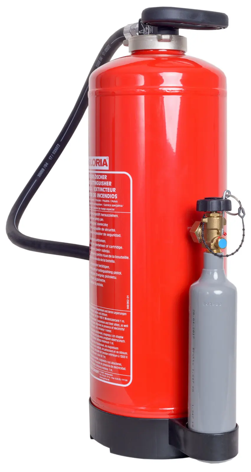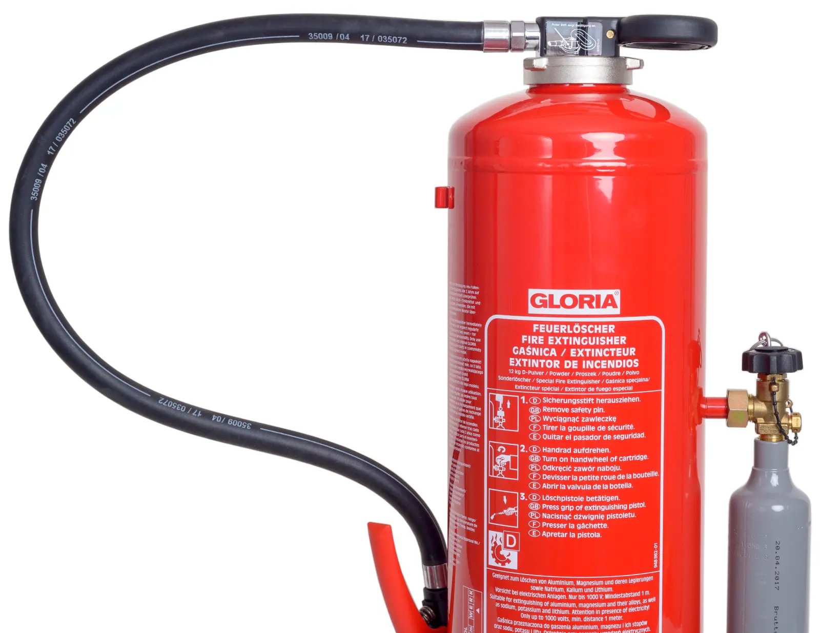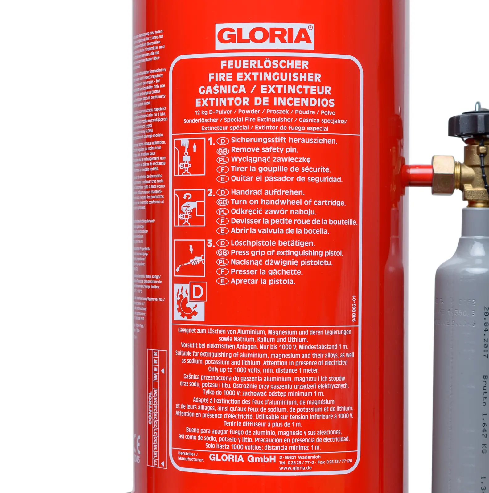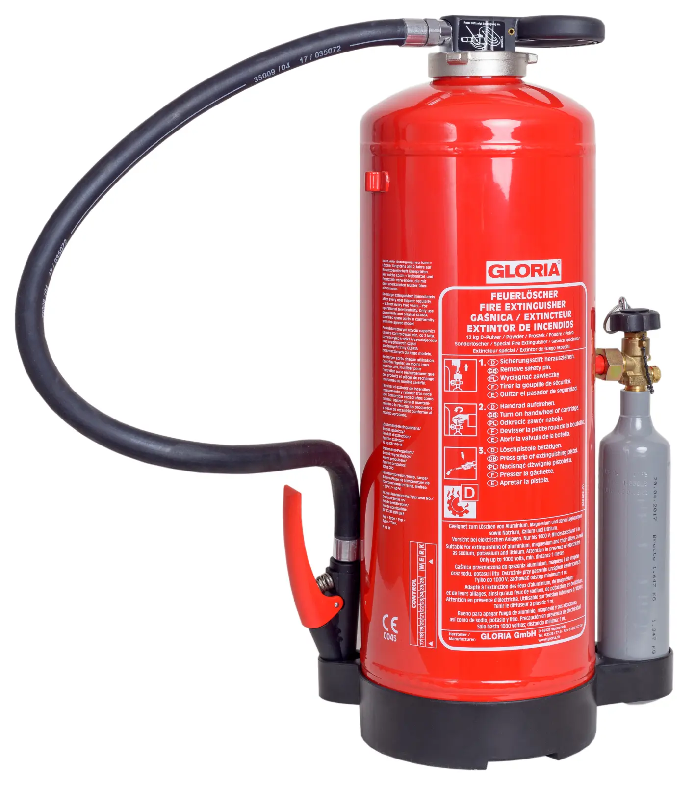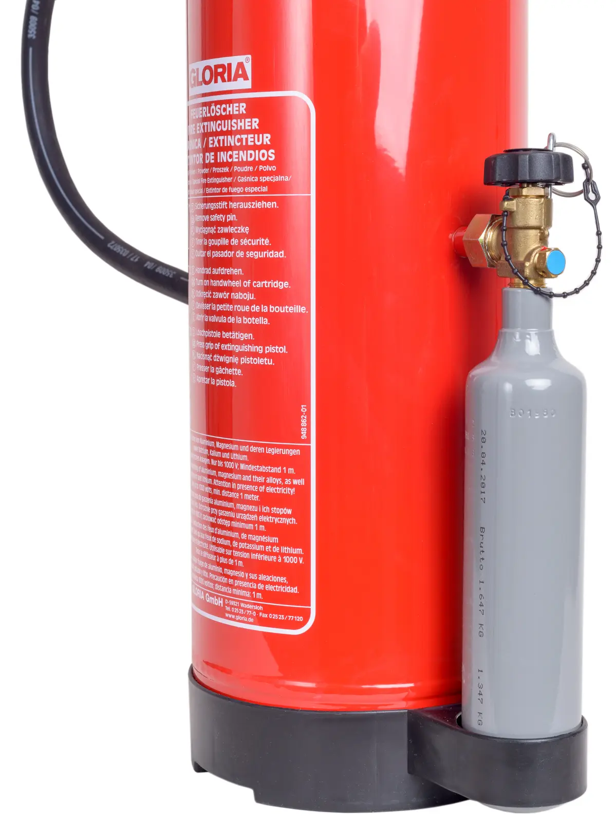 Gaśnica proszkowa 12 kg z zewnętrznym zbiornikiem dwutlenku węgla, z wieszakiem, przeznaczona do zwalczania pożarów metali: