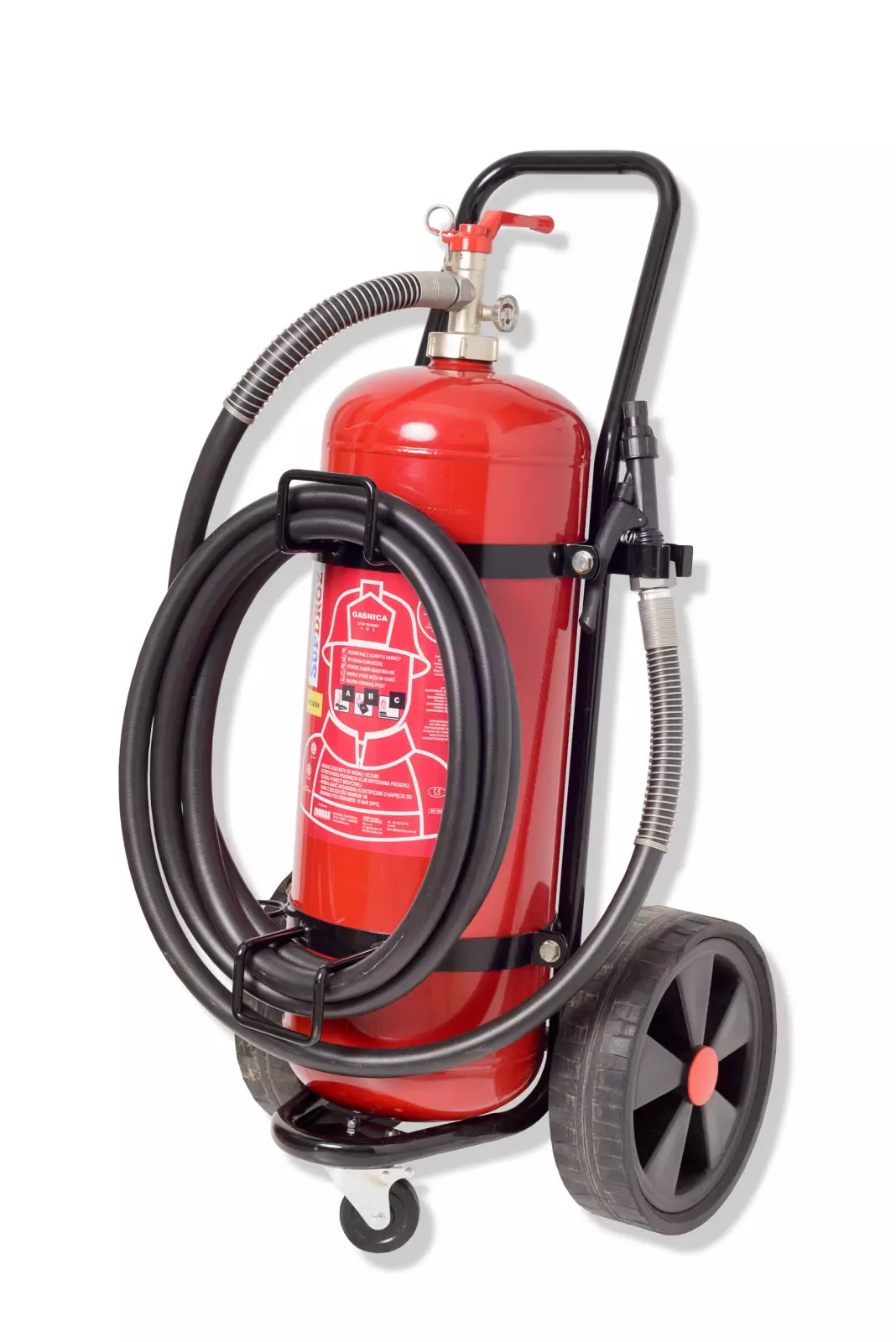 25-kilogramowa gaśnica proszkowa na 3 kołach z 5-metrowym wężem, manometrem z zaworem bezpieczeństwa i kołami o wysokiej wytrzymałości.