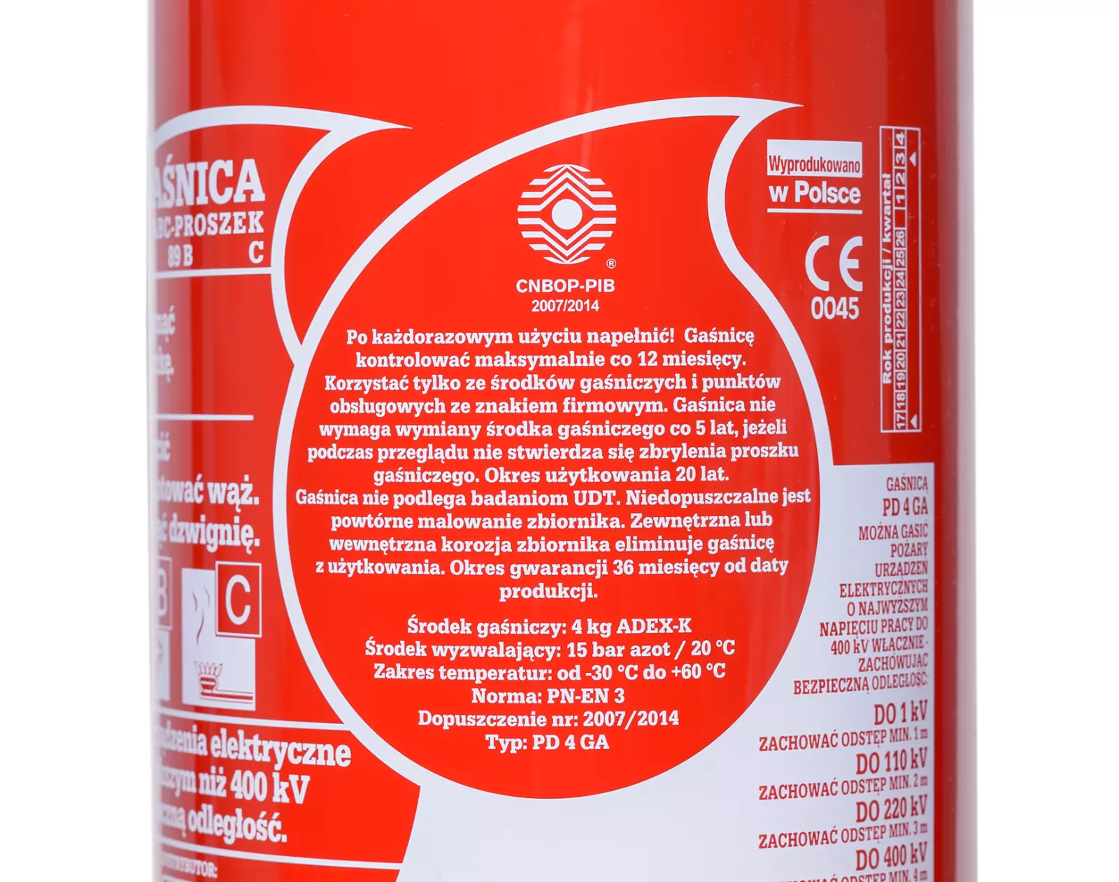 Gaśnica wyprodukowana zgodnie z wszystkimi wymaganiami norm PN-EN-3-7, EN-3-8, EN-3-9, EN-3-10