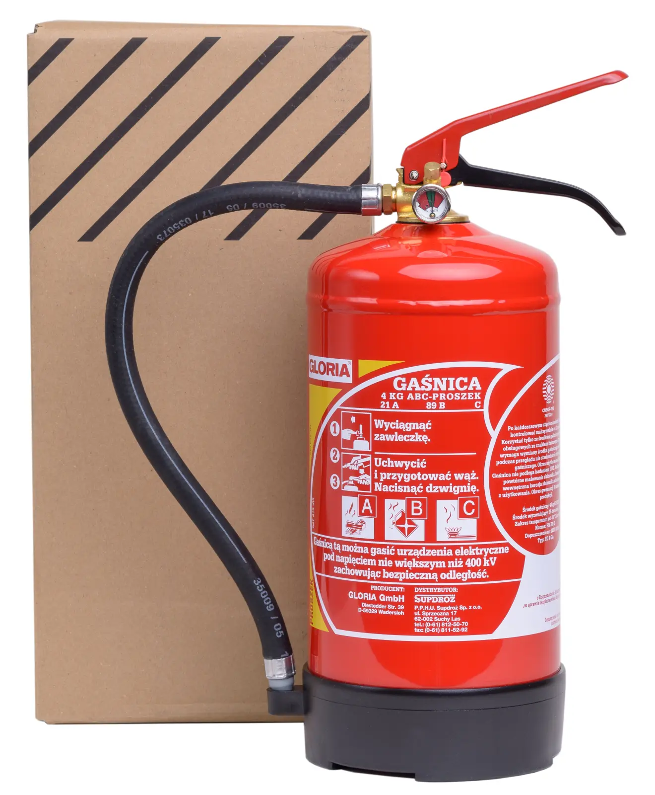 Gaśnica proszkowa 4 kg w zestawie z wieszakiem, przeznaczona do gaszenia pożarów grup: