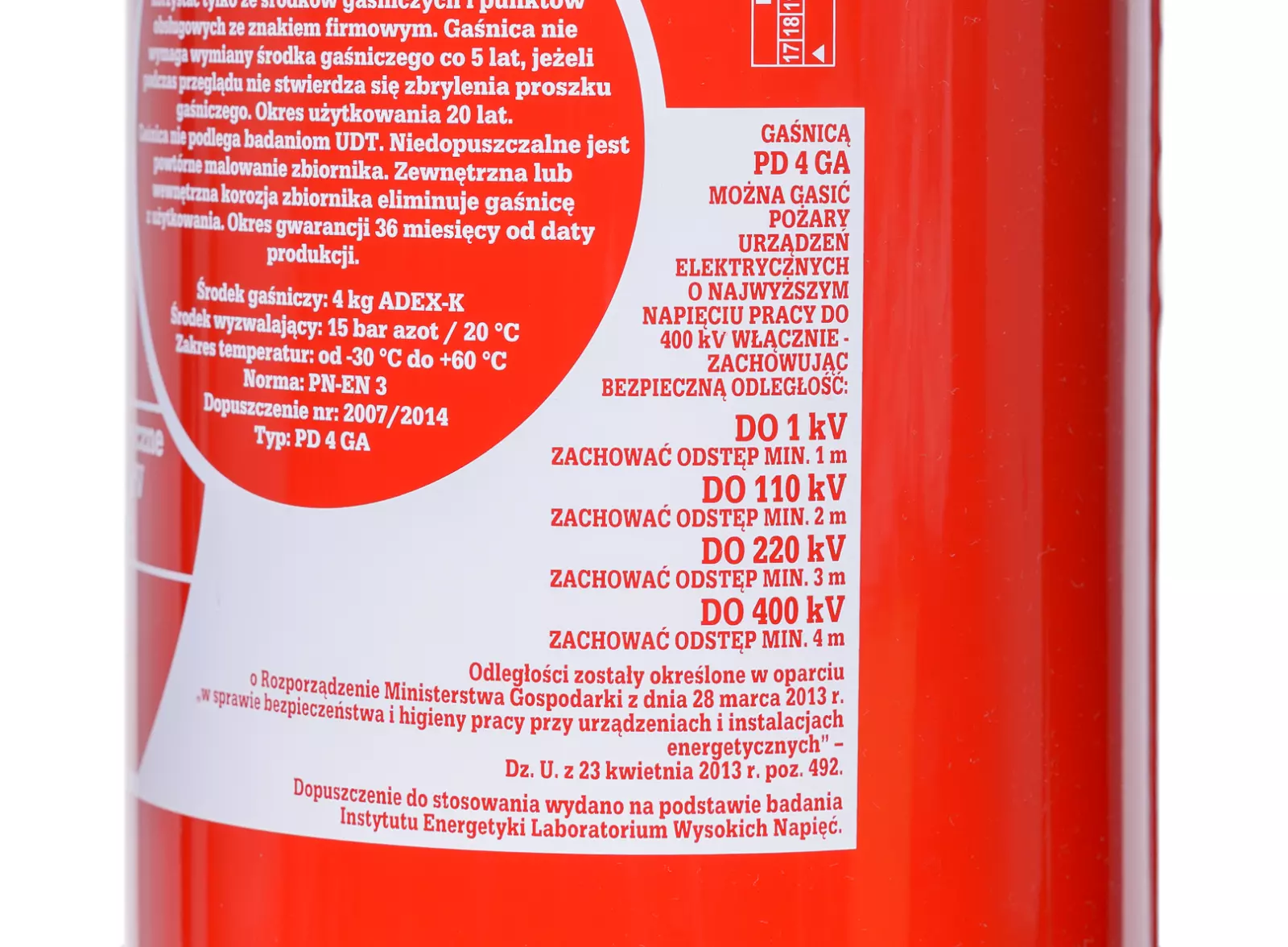 Gaśnica PD 4 GA posiada wysoką skuteczność gaśniczą 21A 89B