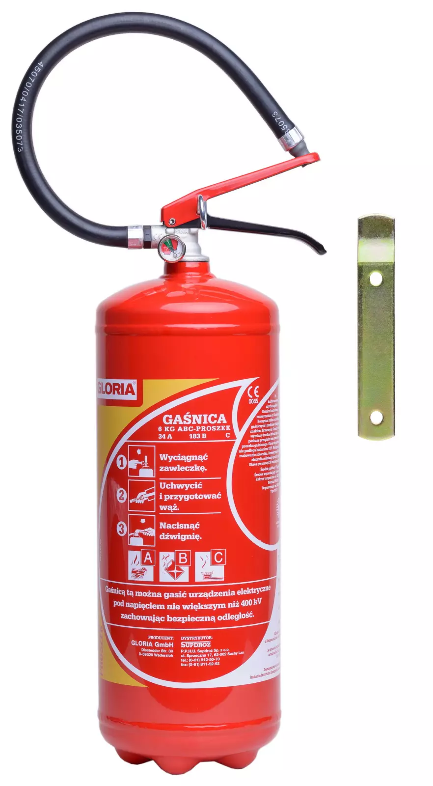Korzystna cenowo gaśnica proszkowa 6 kg , z wieszakiem, przeznaczona do gaszenia pożarów grup: