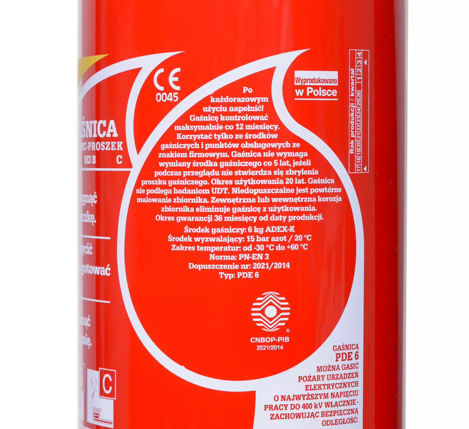 Gaśnica wyprodukowana zgodnie z wszystkimi wymaganiami norm PN-EN-3-7, EN-3-8, EN-3-9, EN-3-10
