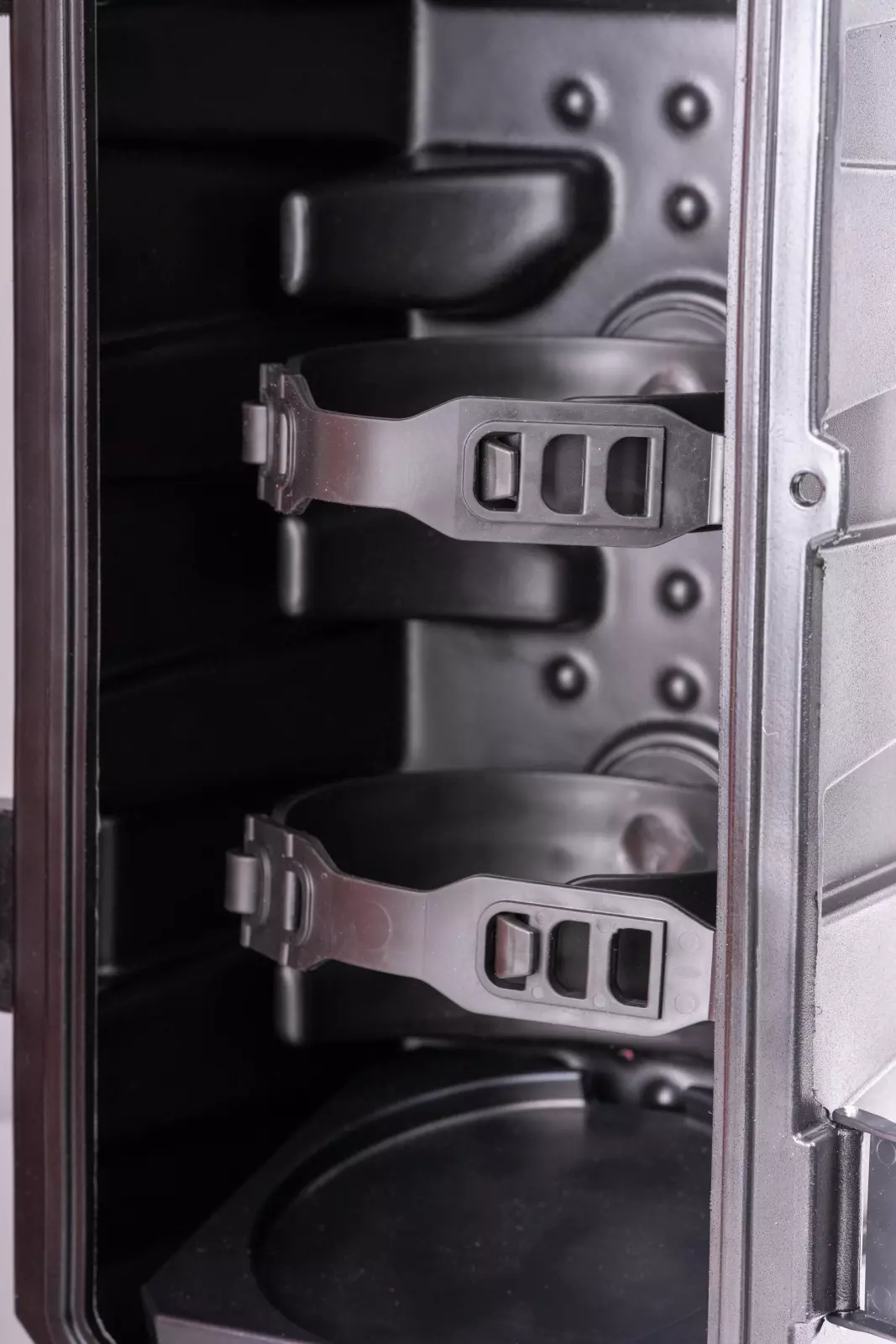 Profilowane dno pojemnika dobrze stabilizuje gaśnicę w czasie jazdy, gaśnica jest dodatkowo przytrzymywana przez dwie obejmy zapinane na paskach gumowych, z możliwością regulacji siły napięcia pasków.